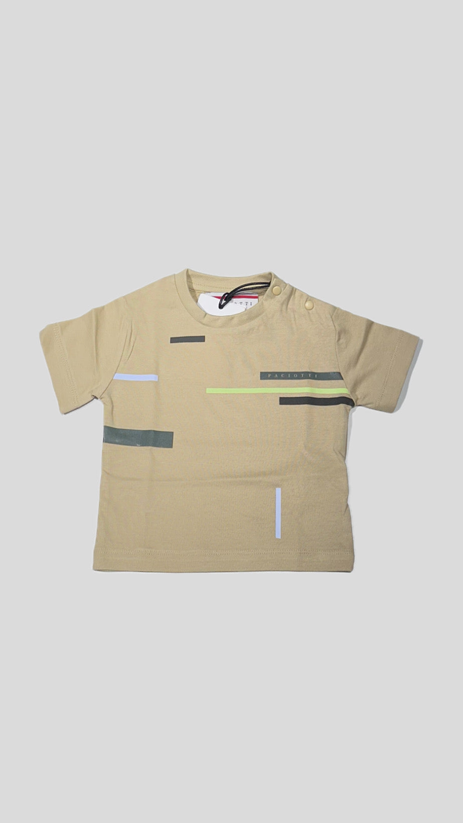T-Shirt Paciotti neonato/bambino, fondo Beige, fantasia sul davanti con logo in contrasto di colore, vestibilità regolare.