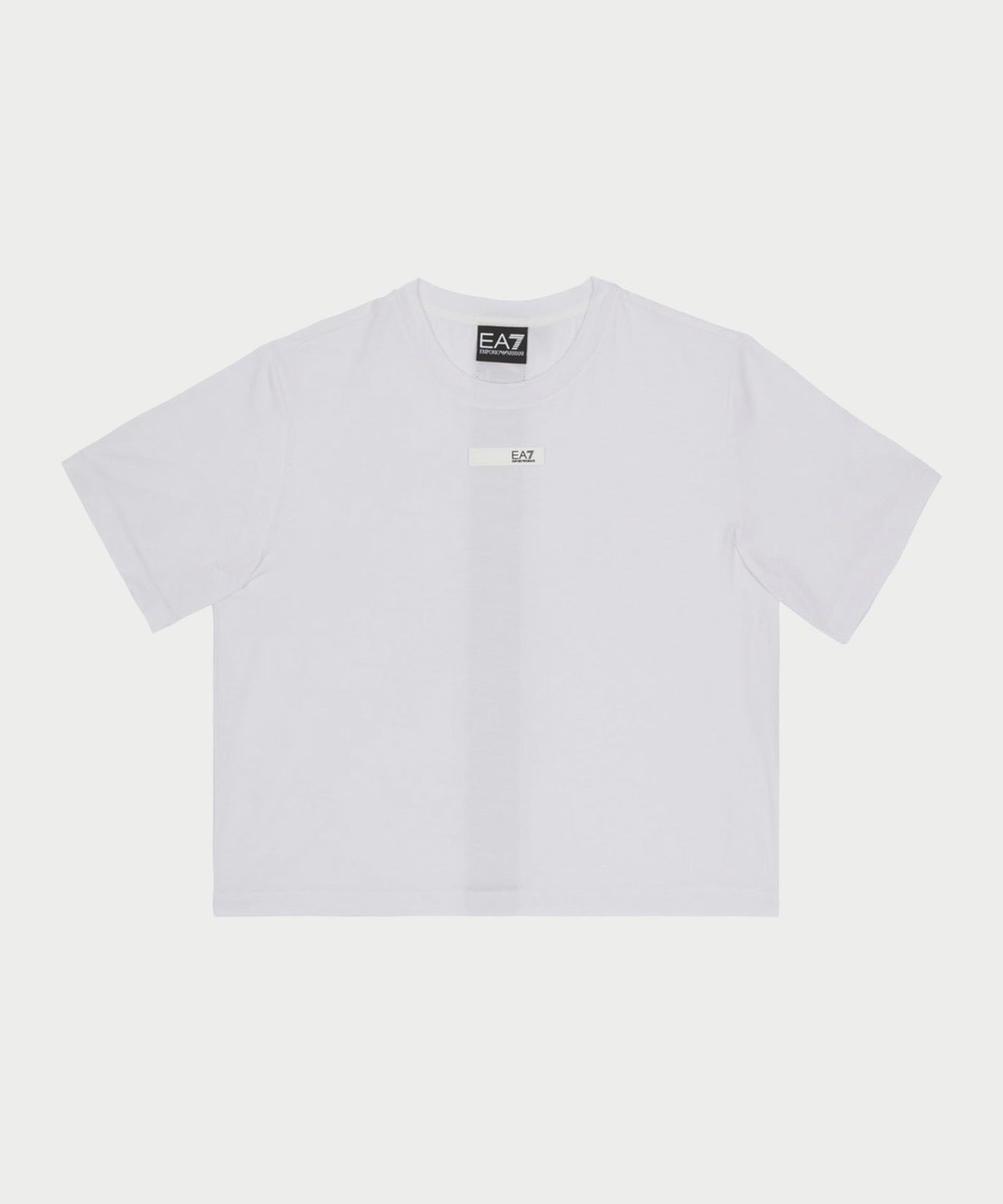 T-Shirt Emporio Armani fondo Bianco, Bimba/Ragazza. Realizzata con banda sul retro logata in contrasto di colore, e logo centrale sul davanti, vestibilità regolare.