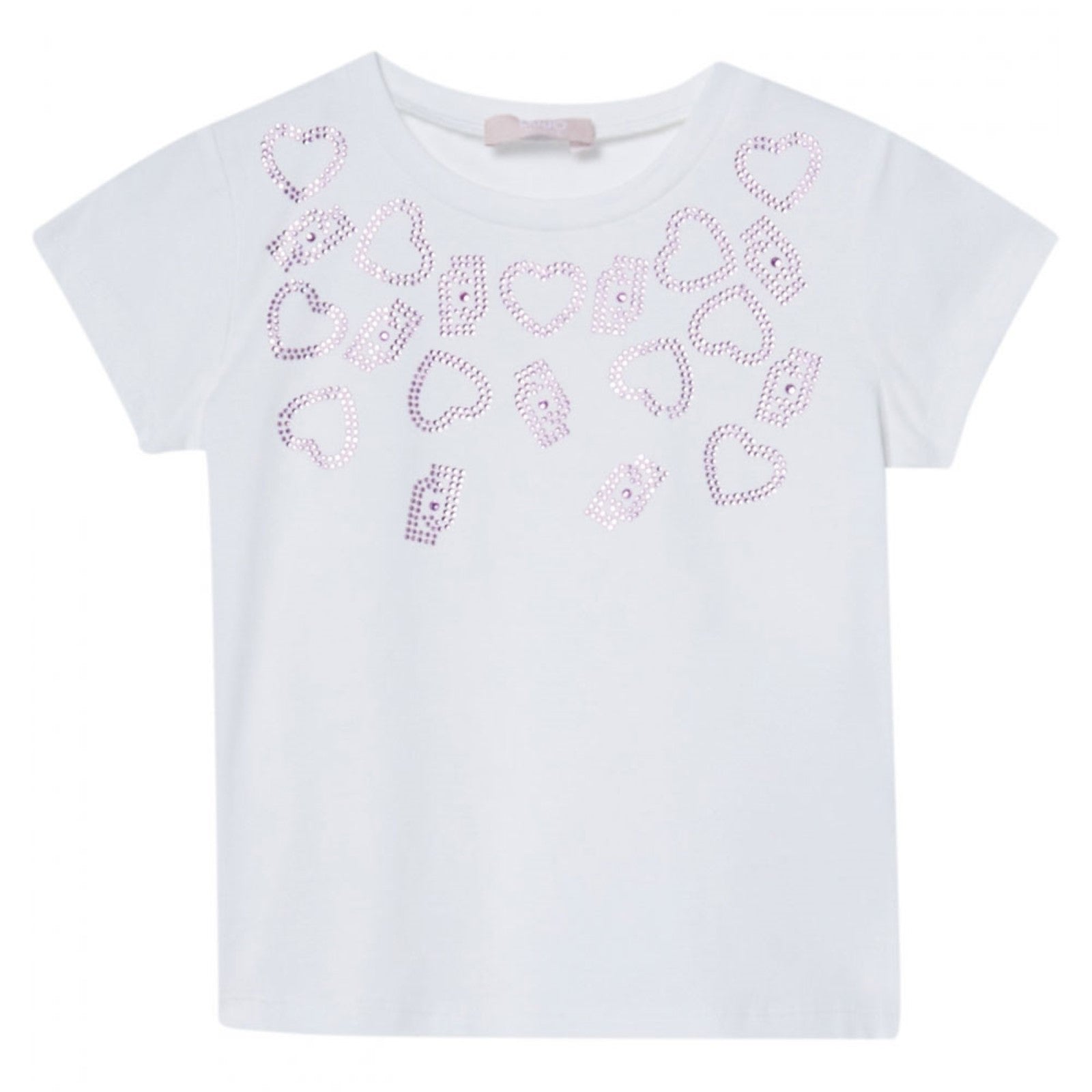 T-shirt bambina Liu Jo. Fondo Bianco con strass sul davanti in contrasto di colore, vestibilità regolare.