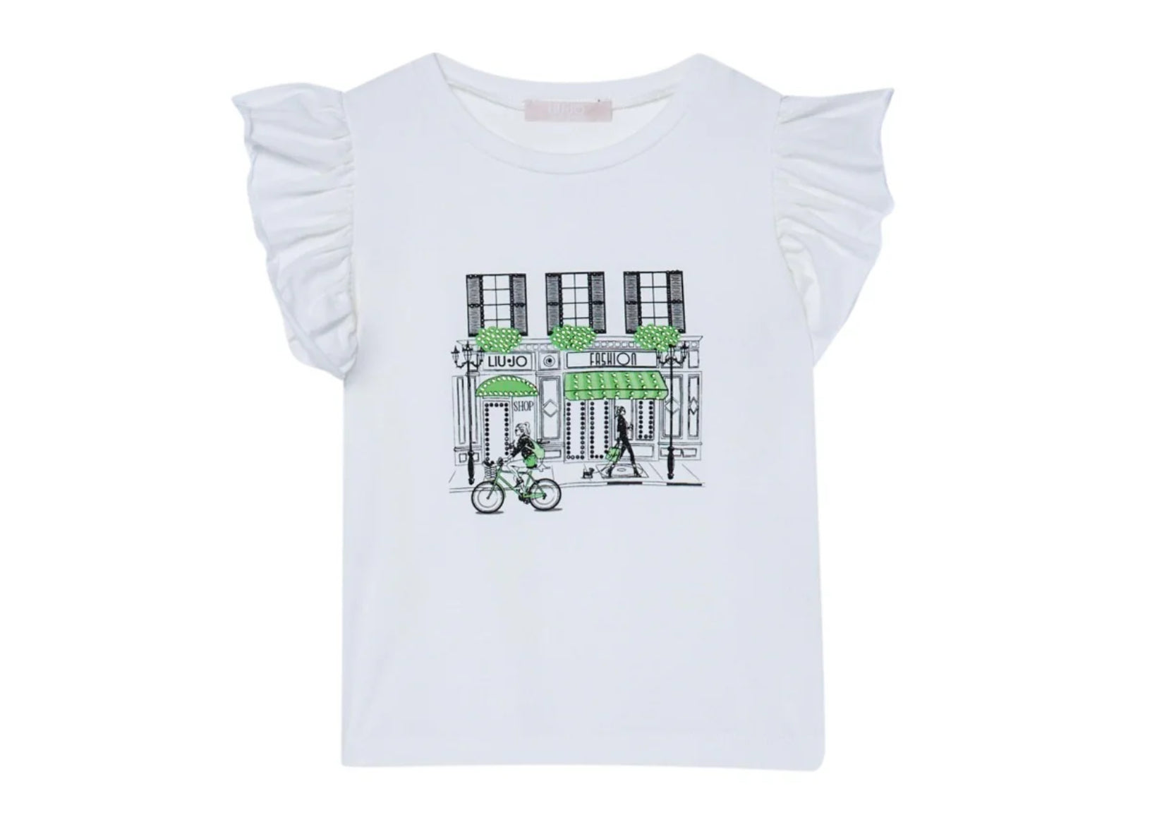 T-Shirt Liu Jo bimba, fondo Bianco. Realizzata con manica con volant, fantasia sul davanti in contrasto di colore, logo con strass, vestibilità regolare.