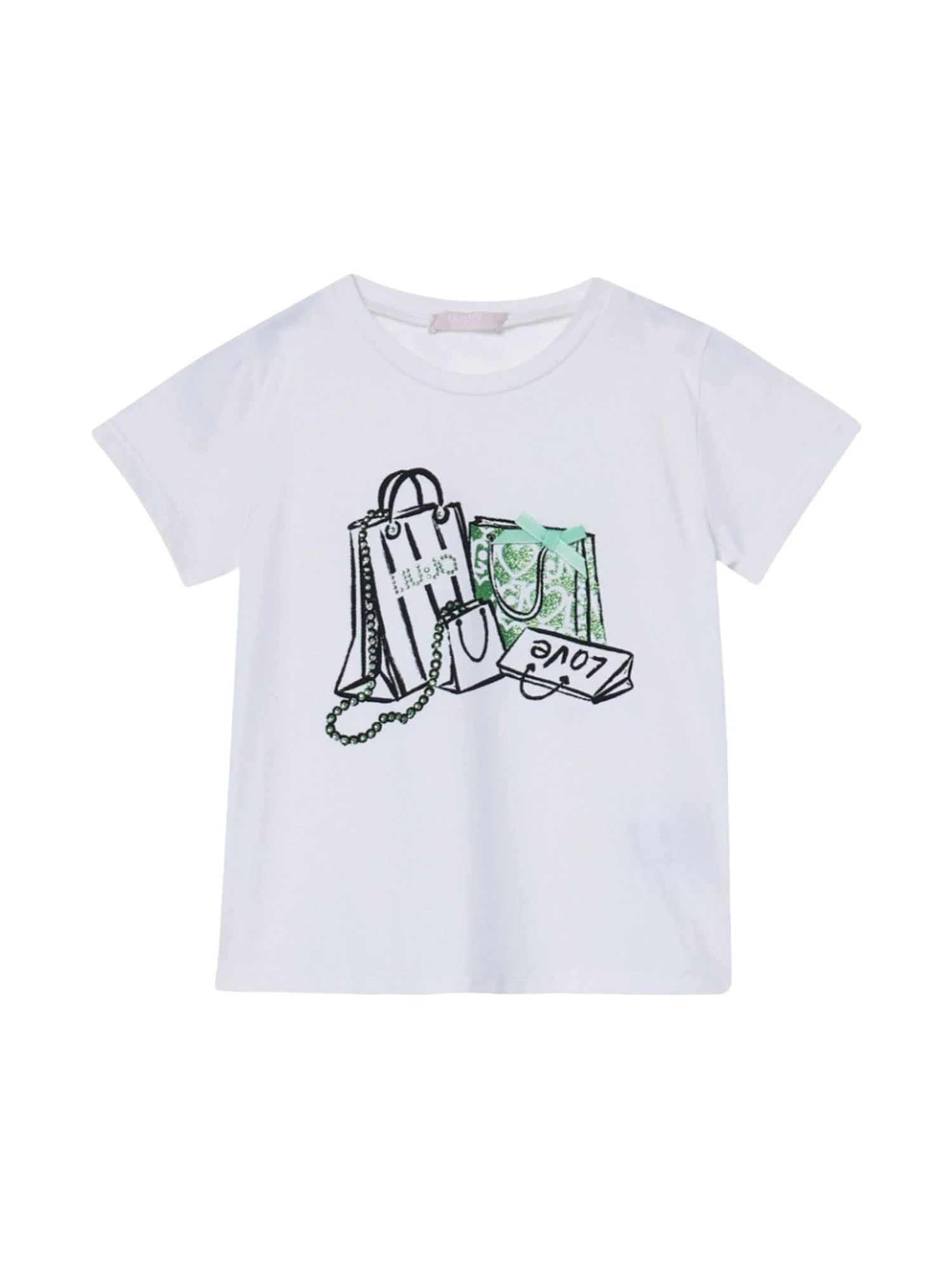 T-Shirt bimba Liu Jo fondo Bianco. Realizzata con fantasia a e logo in strass sul davanti, vestibilità regolare.