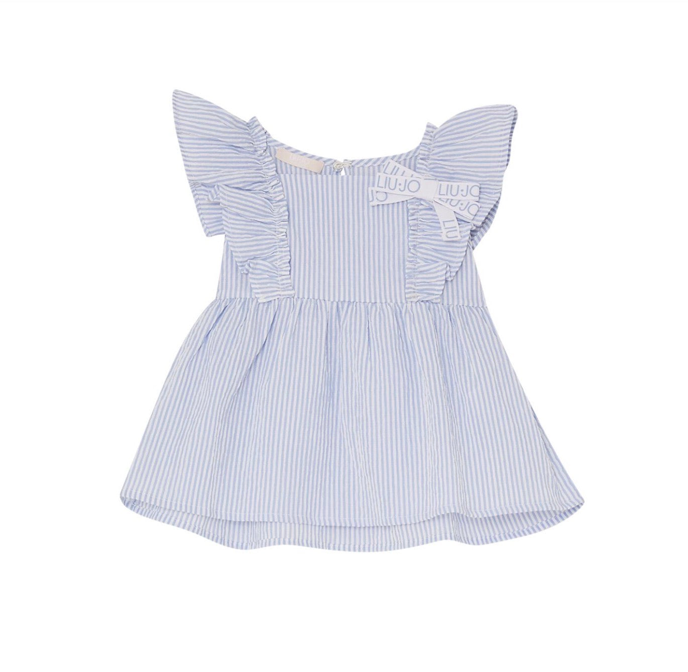 Top Liu Jo bambina, fondo gessato, maniche con volant. Fiocchetto laterale con logo, vestibilità regolare.