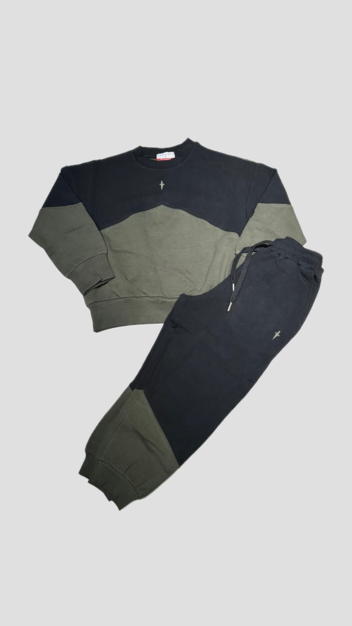 Tuta Completa Paciotti bimbo/ragazzo, in cotone felpato. Bicolor Verde/Nero. Realizzata con logo centrale in contrasto di colore, giricollo. Pantalone comodo con tasche laterali ed elastico in vita, vestibilità regolare.