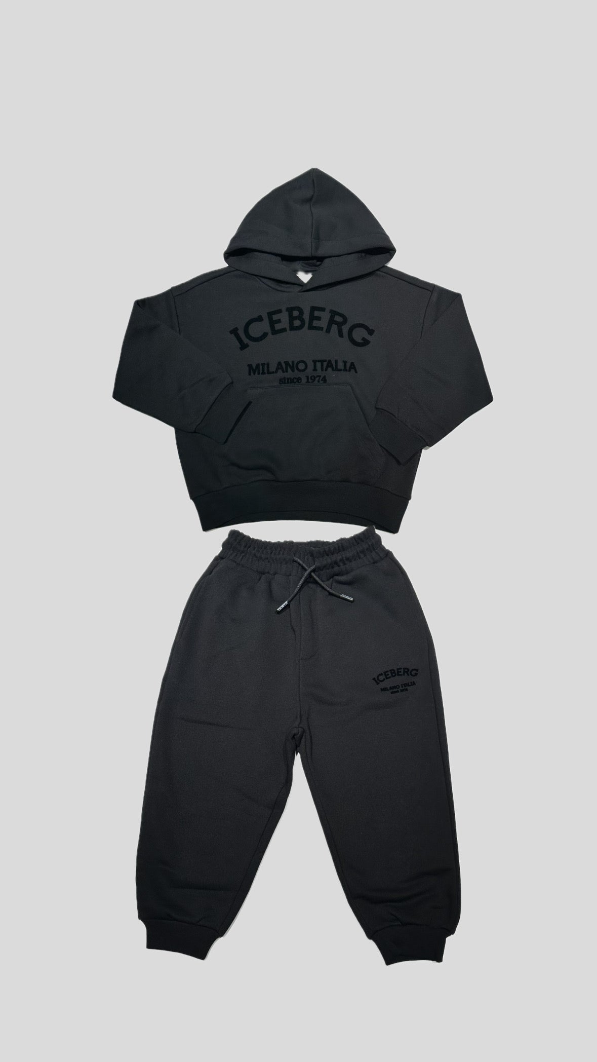 Tuta Completa bimbo/ragazzo Iceberg, fondo Nero. Composta dalla felpa con cappuccio, tascone sul davanti, logo in vellutino centrale, pantalone con comodo elastico in vita, vestibilità regolare.