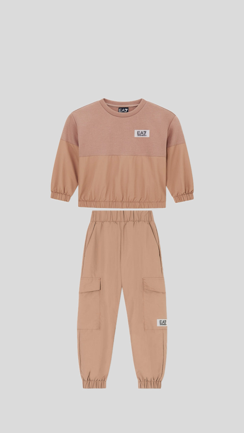 Tuta Emporio Armani Bimba/Ragazza. Fondo Biscotto. Composta dalla felpa modello cropped, in doppio tessuto, logo laterale in rilievo, pantalone modello cargo con comodo elastico in vita.