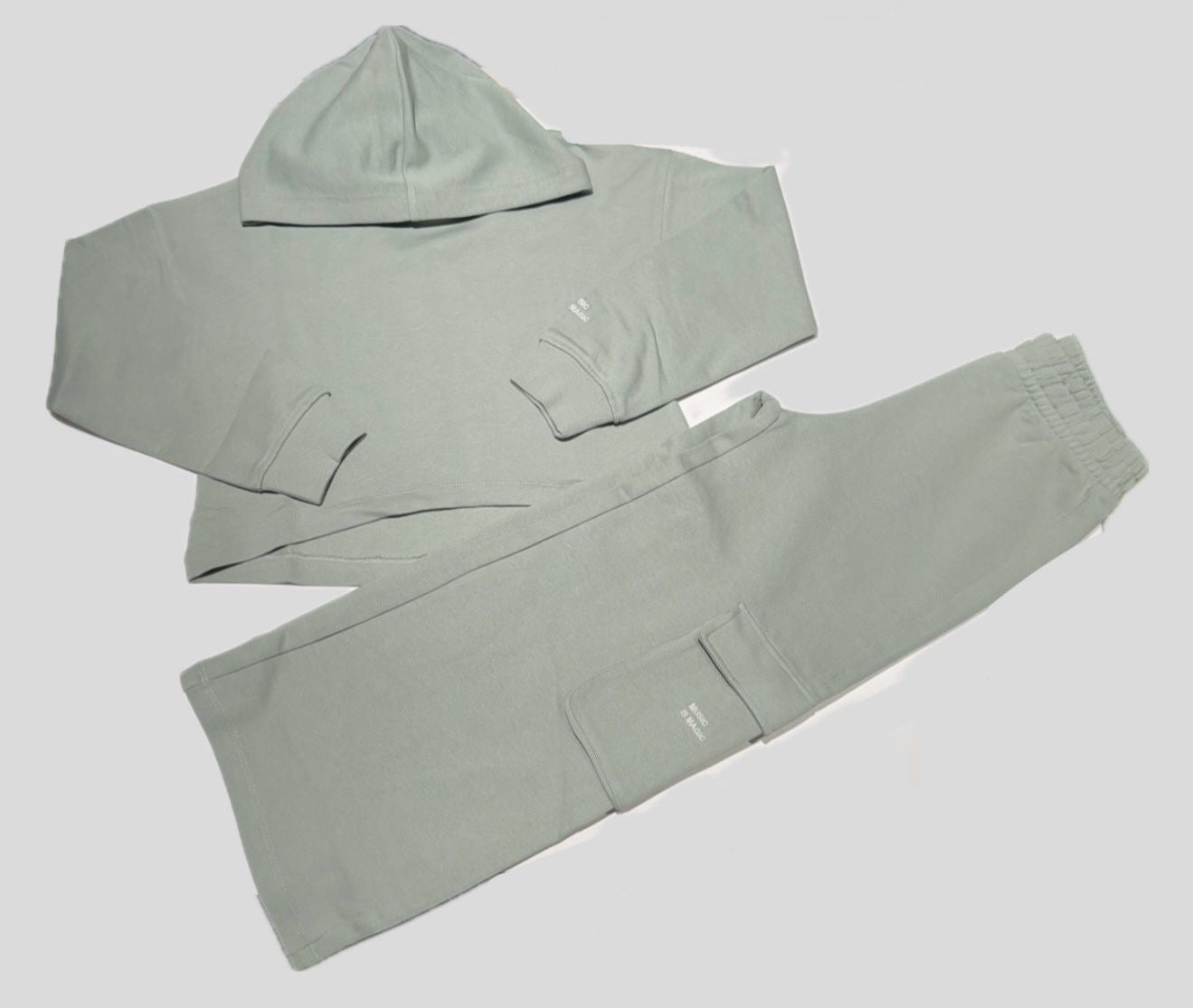 Tuta Sarabanda ragazza, realizzata in cotone garzato. Composta dalla felpa modello cropped con cappuccio e pantalone a palazzo con tasconi laterali modello cargo, fondo Verde Menta, vestibilità regolare.