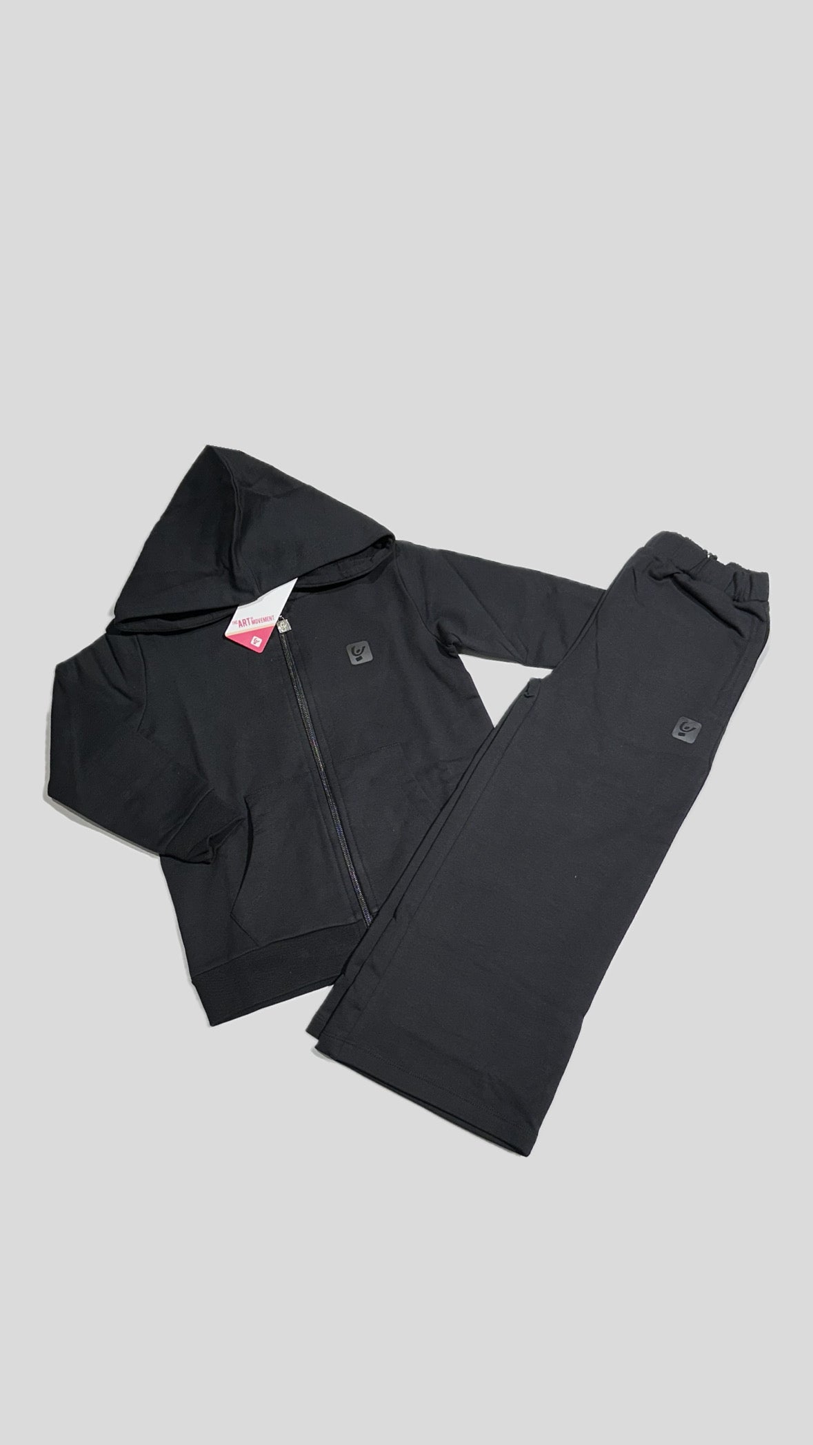 Tuta Completa Freddy Bimba/Ragazza. Fondo Nero. Realizzata dalla felpa con zip e cappuccio, logo laterale tono su tono. Pantalone a palazzo con comodo elastico in vita, vestibilità regolare.