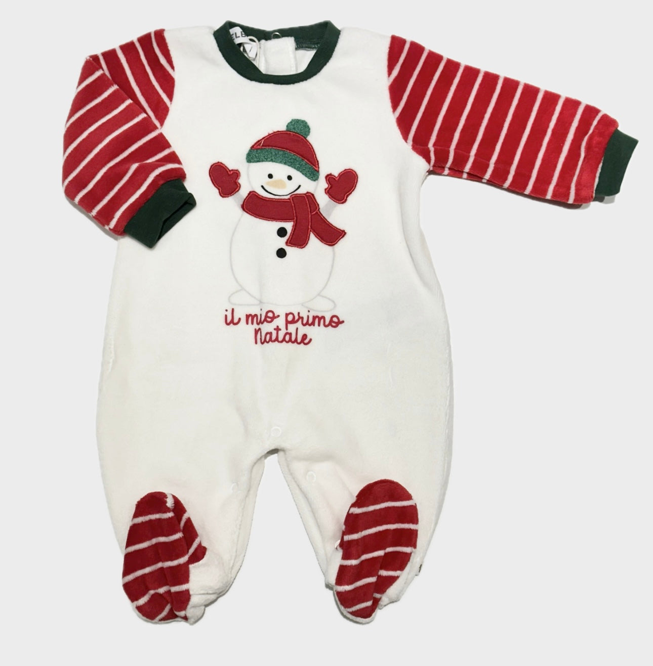 Tutina in ciniglia in fantasia Natale , chiusura sul retro e sul fondo con botttoncini a pressione.