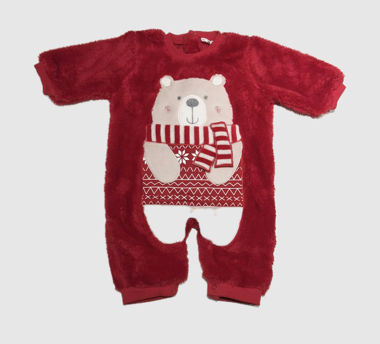 Tutina in tessuto Teddy, unica variante di colore Rosso, fantasia centrale orsetto, chiusura sul fondo e sul retro con bottoni a pressione.