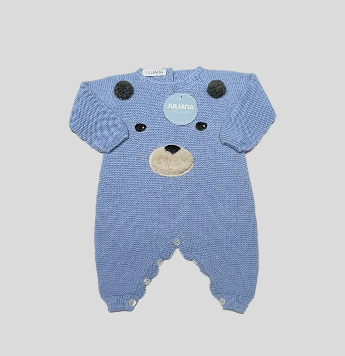 Tutina Juliana Neonato, fondo Cielo. Fantasia orsetto sul davanti, chiusura sul fondo e sul retro, vestibilità regolare.