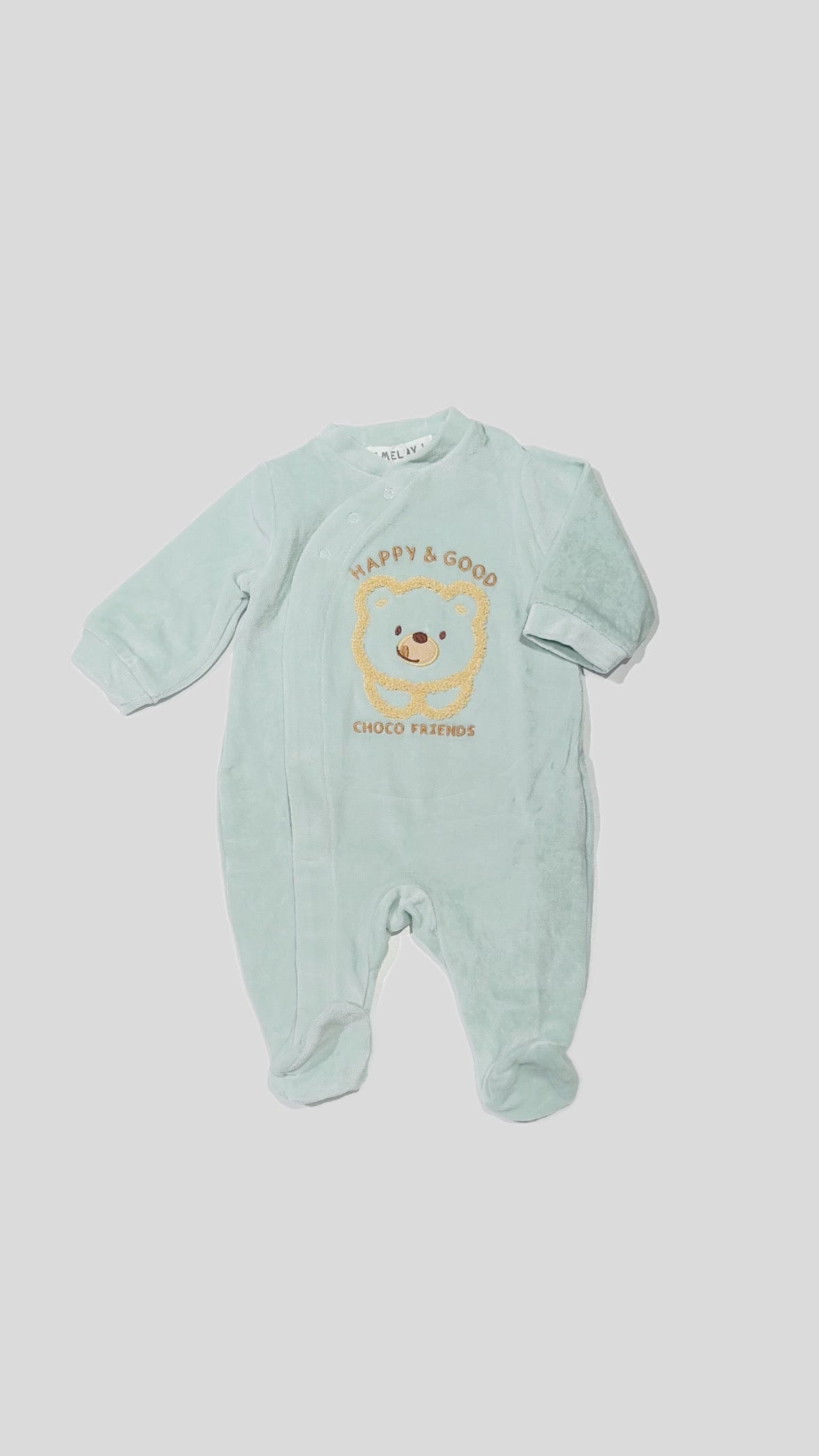 Tutina Melby neonato in ciniglia fondo Verde, apertura sul davanti, fantasia orsetto. Vestibilità regolare.