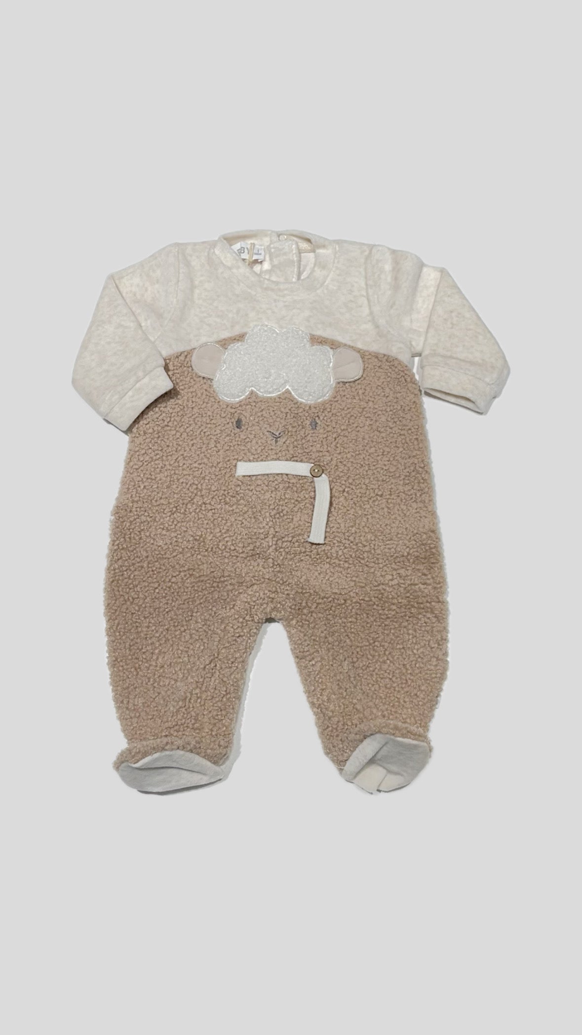 Tutina Melby Neonata, realizzata in doppio tessuto, Ciniglia e tessuto Teddy, fondo Beige, con profili in contrasto di colore, vestibilità regolare.