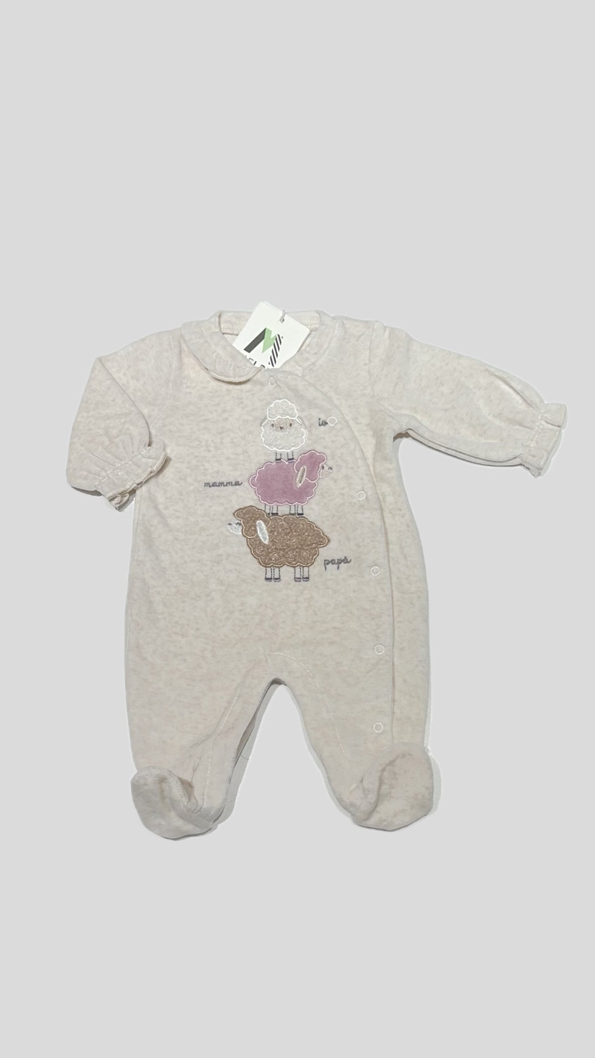 Tutina Melby Neonata, realizzata in ciniglia, fondo Beige, con profili in contrasto di colore, apertura sul davanti e sul fondo, vestibilità regolare.