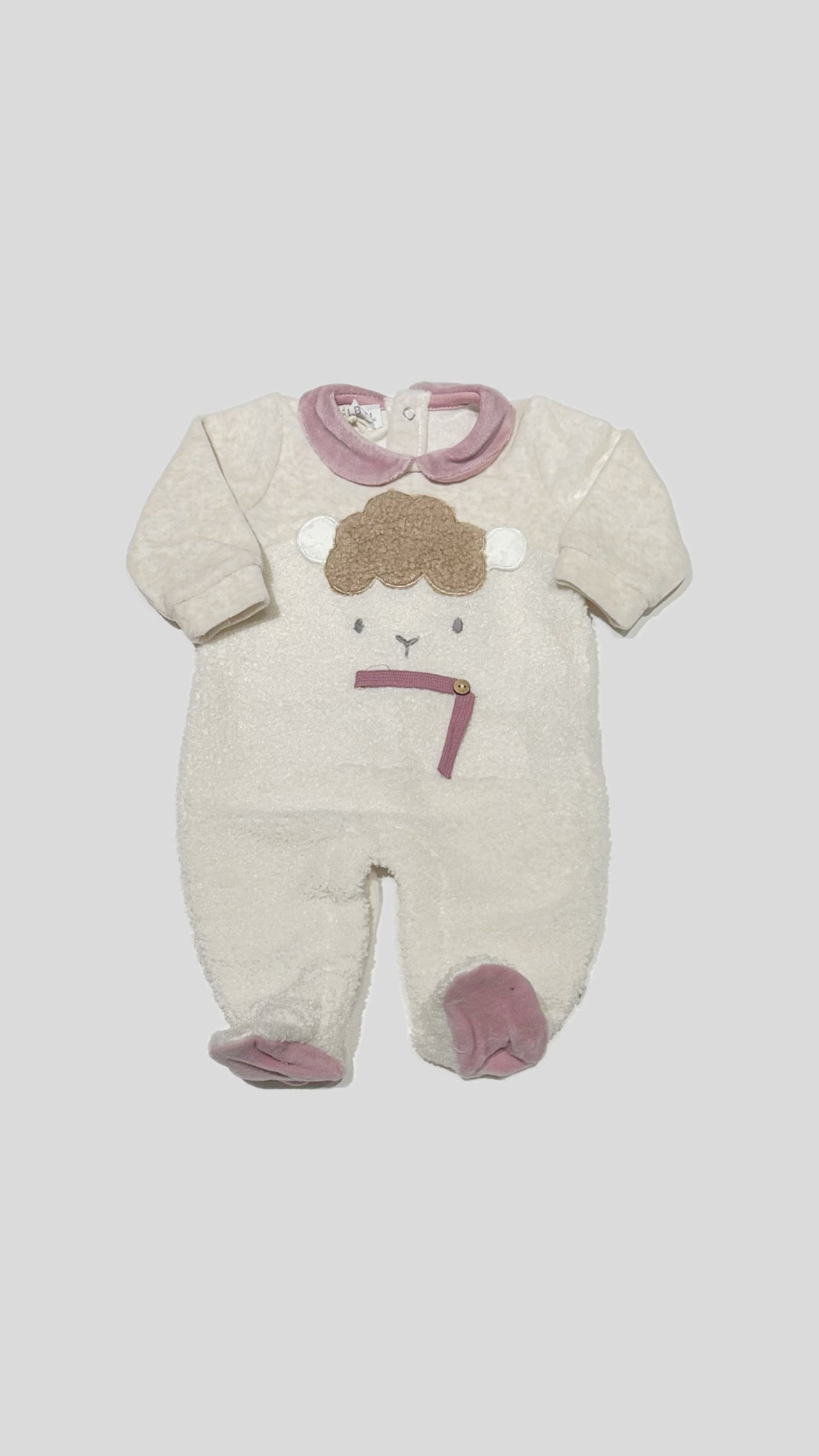 Tutina Melby Neonata, realizzata in doppio tessuto, Ciniglia e tessuto Teddy, fondo Beige, con profili in contrasto di colore, vestibilità regolare.