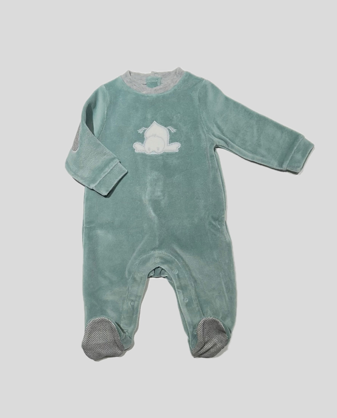 Tutina neonato Minibanda in ciniglia, fondo Verde con profili in contrasto di colore, chiusura sul retro con bottoni, vestibilità regolare.