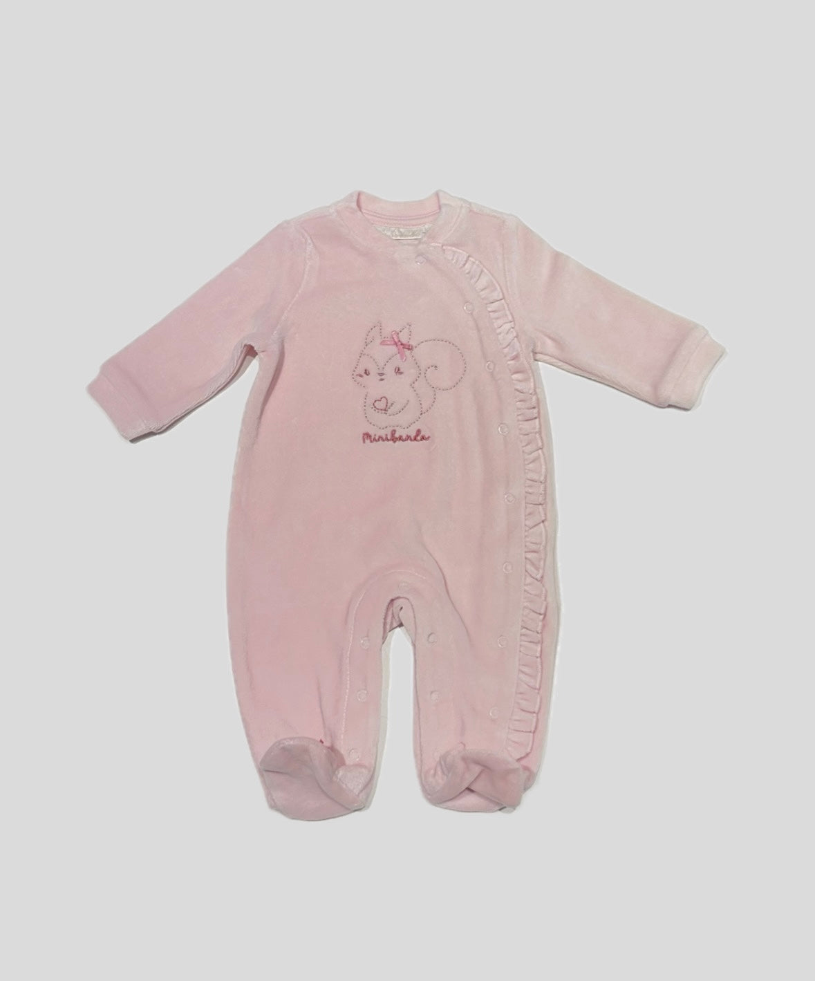 Tutina Minibanda in ciniglia neonata, fondo Rosa. Apertura sul davanti con bottoni, fantasia centrale.