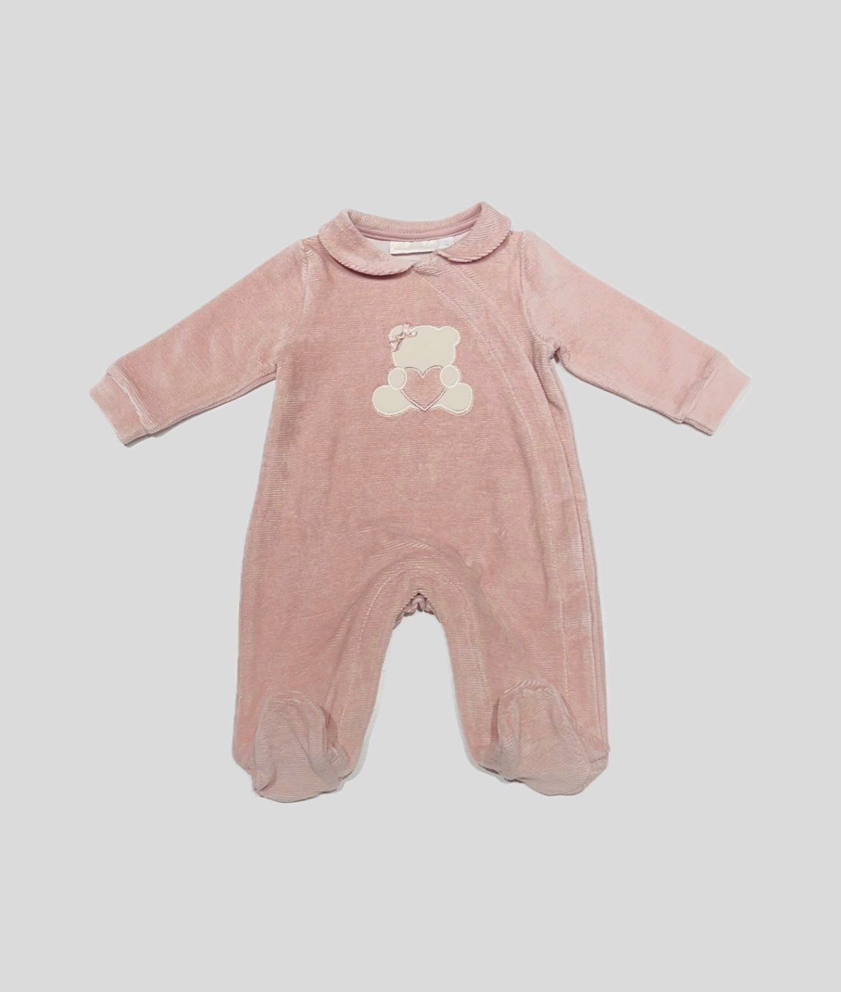 Tutina Minibanda neonata a costine, fondo Rosa con orsetto sul davanti, chiusura sul davanti con bottoni a pressione, vestibilità regolare.