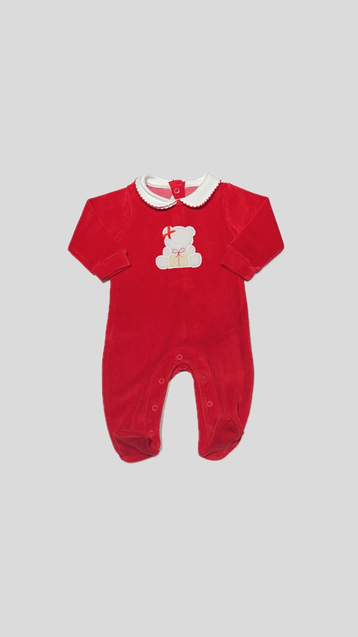 Tutina in ciniglia neonata in fantasia Natalizia, fondo Rosso con ricami e profili in contrasto di colore, chiusura sul fondo e sul retro, vestibilità regolare.
