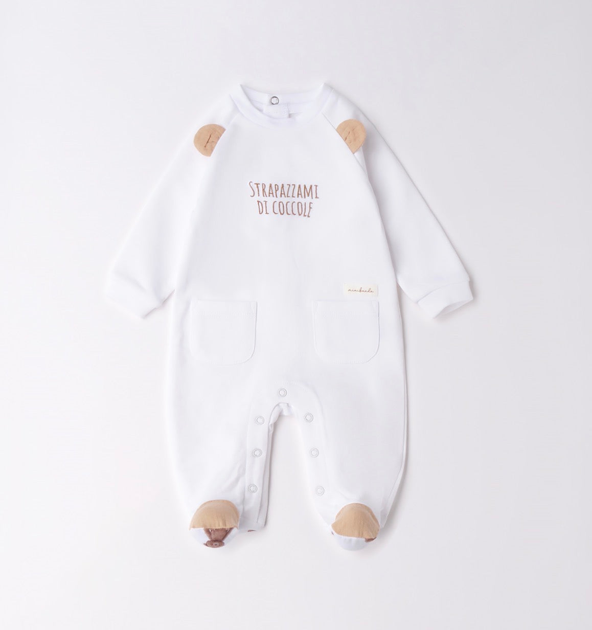 Tutina Minibanda neonato, fondo Bianco con ricami e orecchie da orsetto in rilievo, vestibilità regolare.