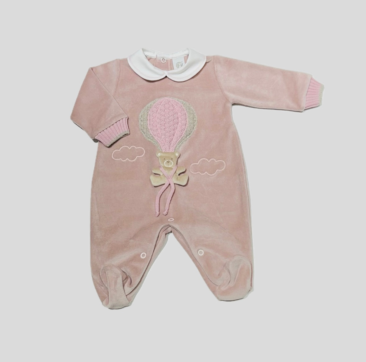 Tutina Marlù in ciniglia fondo Rosa. Colletto classico in contrasto di colore, mongolfiera in rilievo, chiusura sul fondo e sul retro, vestibilità regolare.